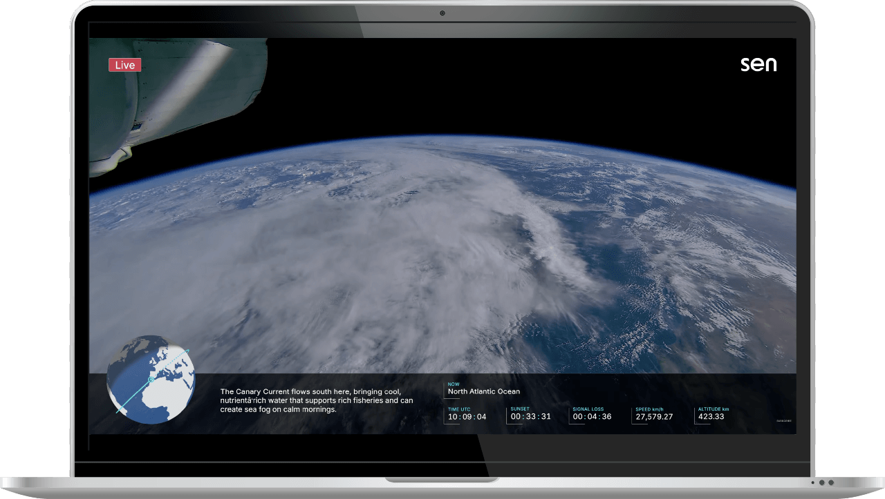 Sen is a video streaming company providing the world’s first ever 4K livestream from space.You can watch Sen 24/7 as Space Live powered by Sen on ITVX. You can also watch Sen 24/7 on YouTube and using the Sen app on sen.com, iOS and Android.